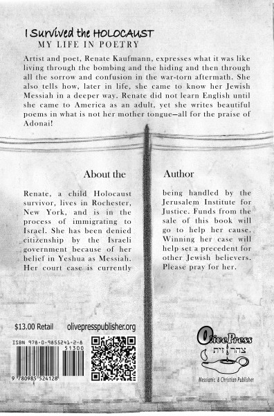 Artist and poet, Renate Kaufmann, expresses what it was like living through the bombing and the hiding of WWII in Germany, and then through all the sorrow and confusion in the war-torn aftermath. She also tells how, later in life, she came to know her Jewish Messiah in a deeper way. Renate did not learn English until she came to America as an adult, yet she writes beautiful poems in what is not her mother tongue—all for the glory of the Lord!