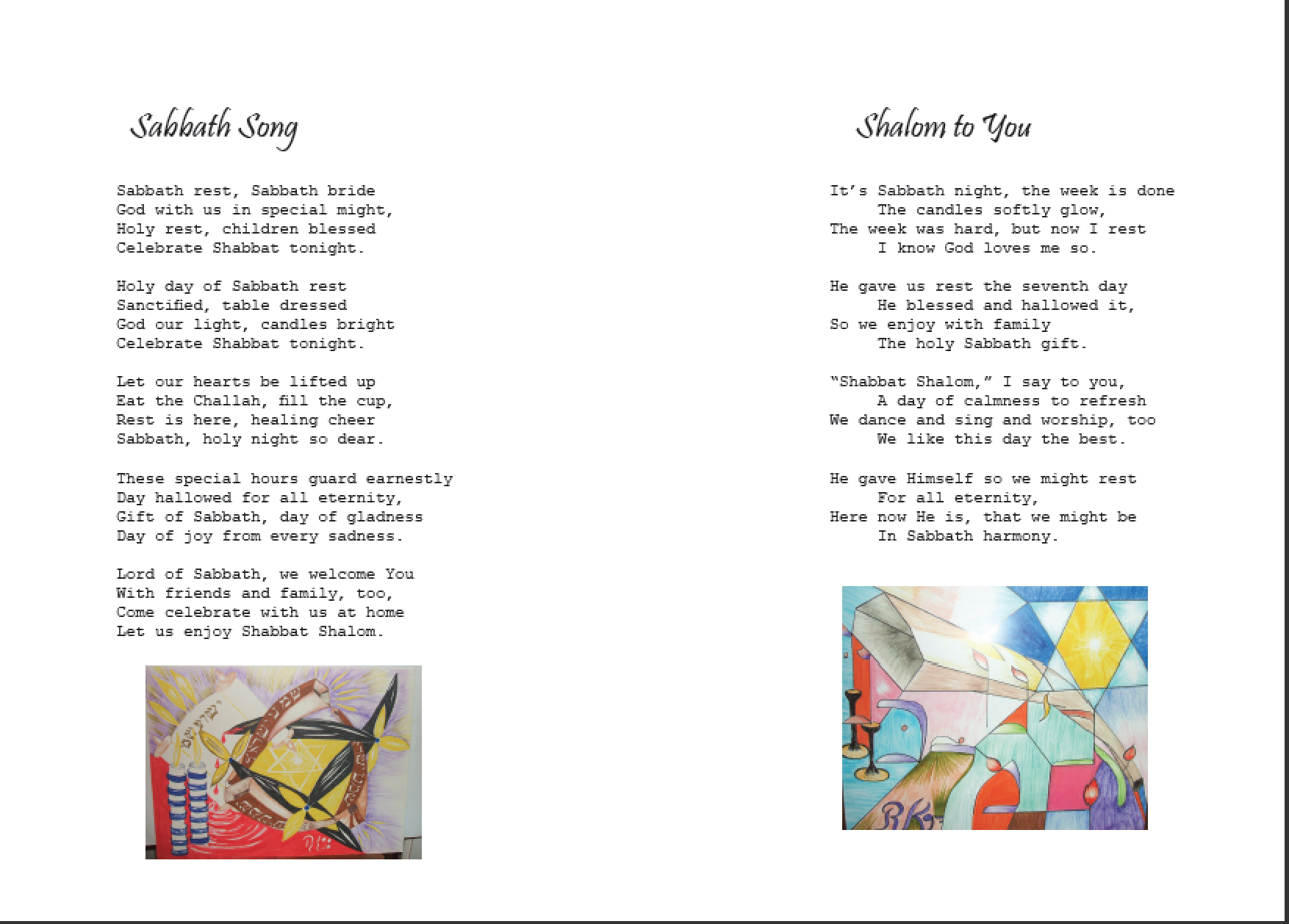 Some of the titles of her poems are: "What Is Peace?" "Why Hate The Jews?" "What Is A Home?" "Mama, Is There Life After Death?" "My Hiding Place" "Who Am I?" "Why G-d Why?" "I Found The Truth" "Not An Alien Anymore" "Let's Be Women Of Influence" "Shalom To You".