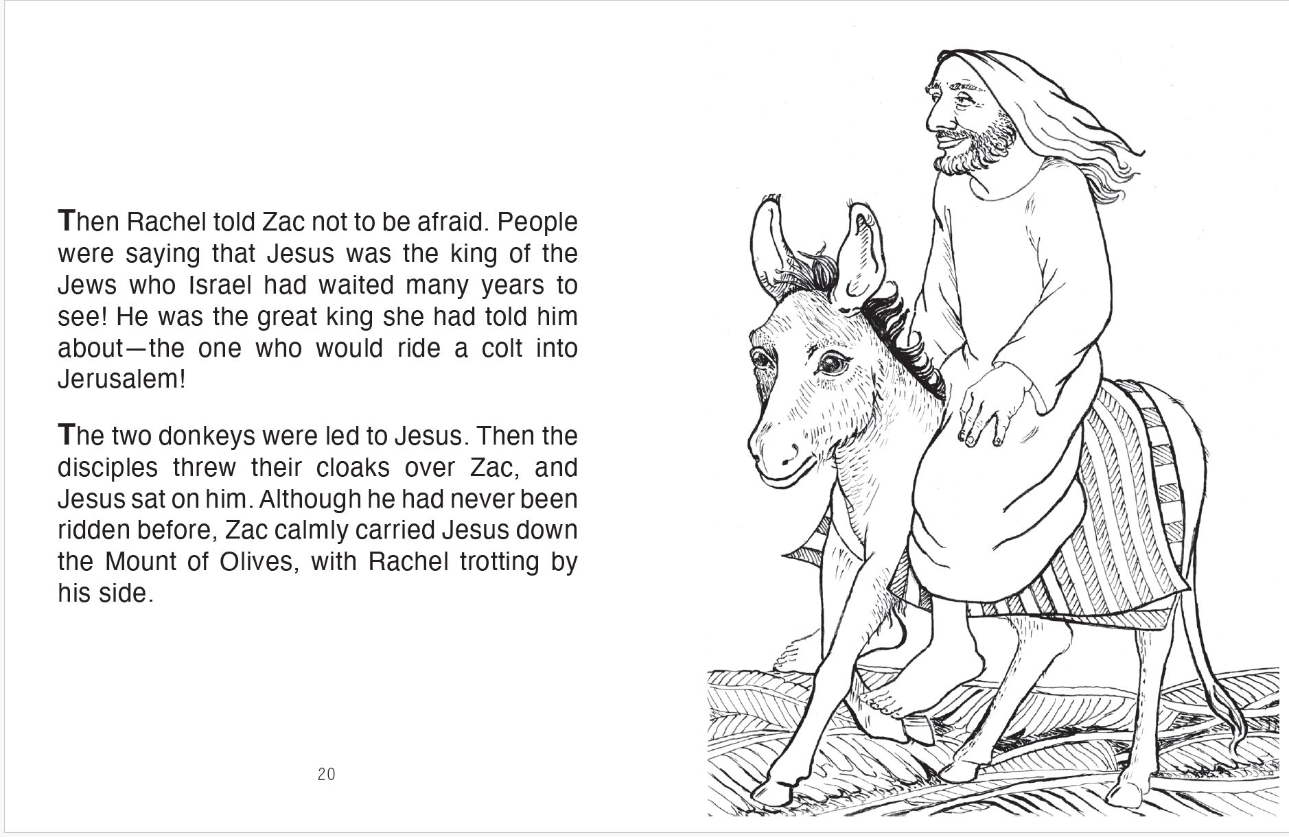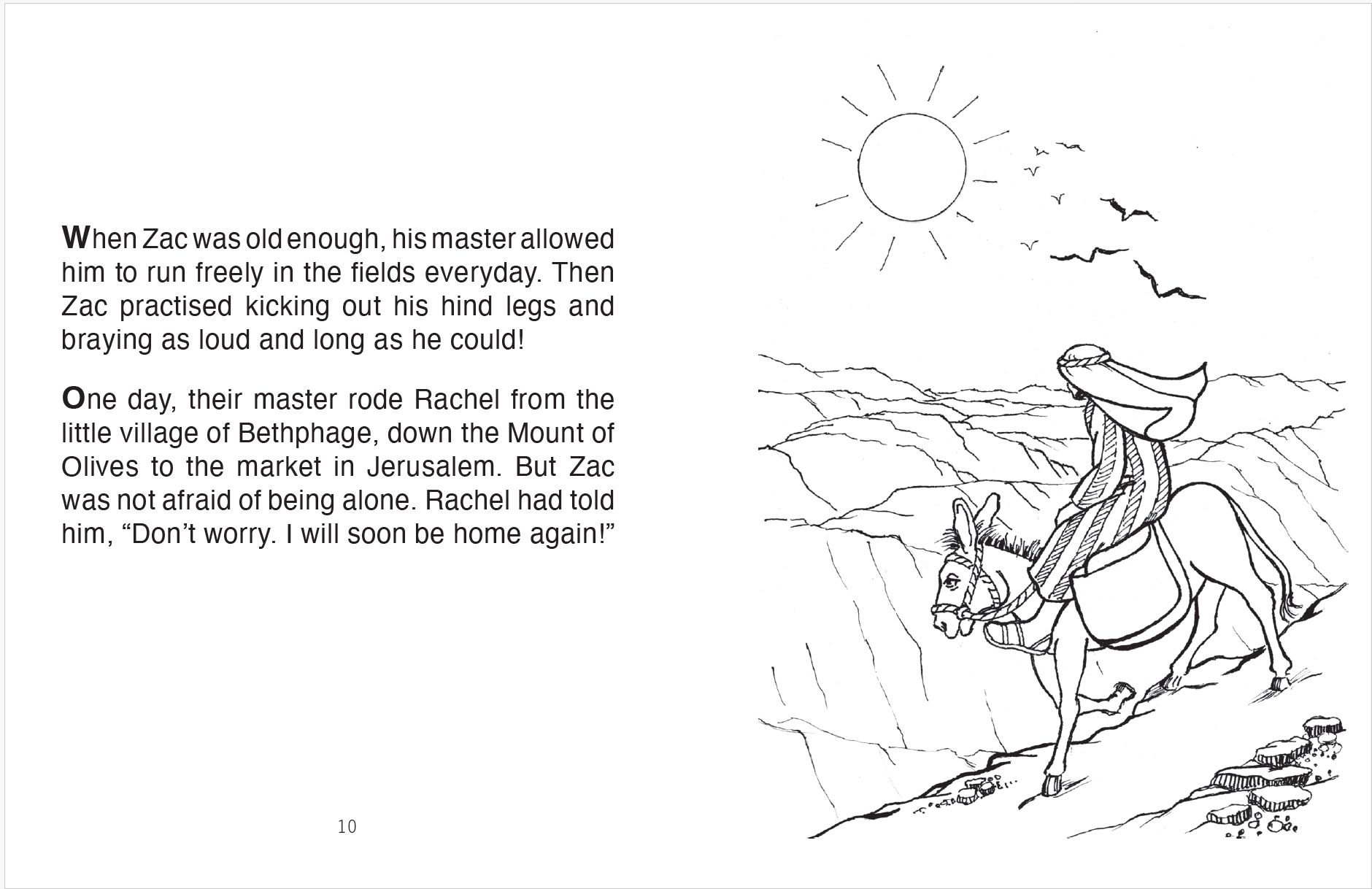 The little donkey named Zac and his mother named Rachel live on a farm in a little village near Jerusalem. Their owner travels to Jerusalem frequently. Lately he talks a lot about a man, Jesus, that he sees in Jerusalem. One day, the little donkey's mother tells an old, old story about a king and a “foal of a donkey” that takes place in Jerusalem. It's a story that is going to happen some day in the future. This was very interesting to the little donkey. This coloring book follows what happens as the little donkey grows up.